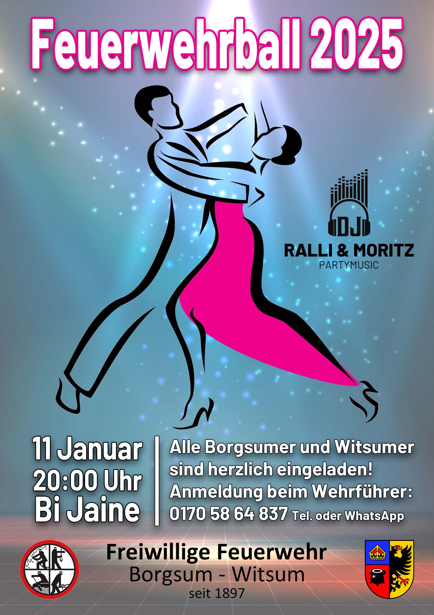 Der Feuerwehrball für alle Borgsumer und Witsumer findet am 10.01.2026 um 20:00 Uhr Bi Jaine statt. Für Stimmung sorgen Ralli und Moritz!